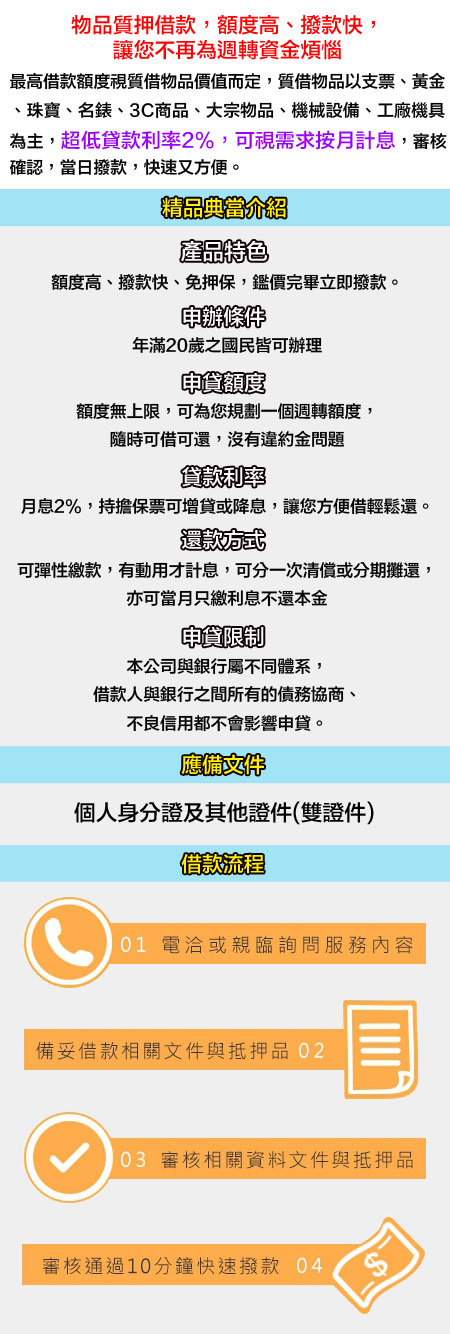 苗栗當舖推薦首選,輕鬆借貸無負擔 苗栗當舖是政府合法成立的當舖,嚴守當鋪法規辦理,秉持誠信、合法、互助精神,力求服務至上、客戶至上,......2022-04-15
